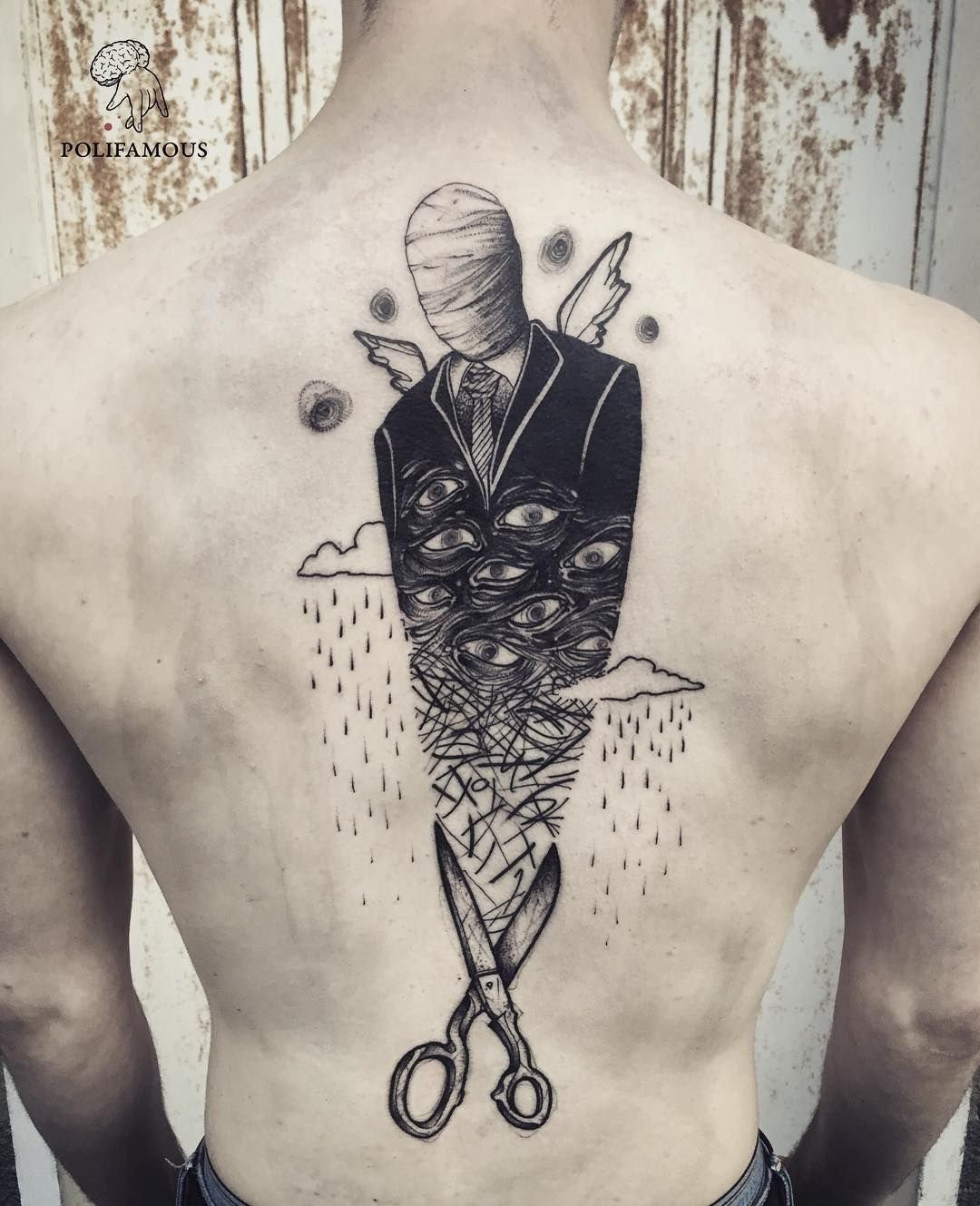 Surrealism Violin Skull 3D Full Back Guys Tattoo